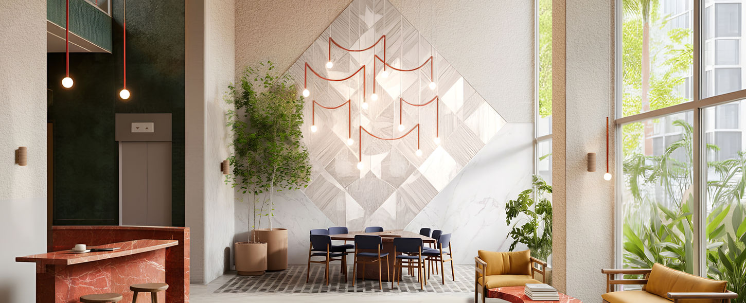 The lobby, spanning 975 sq. ft., showcases exquisite marble flooring and doriing a double-height ceiling enriched with refined textured finishes and intricate marble inlays, echoing contemporary design sensibilities.